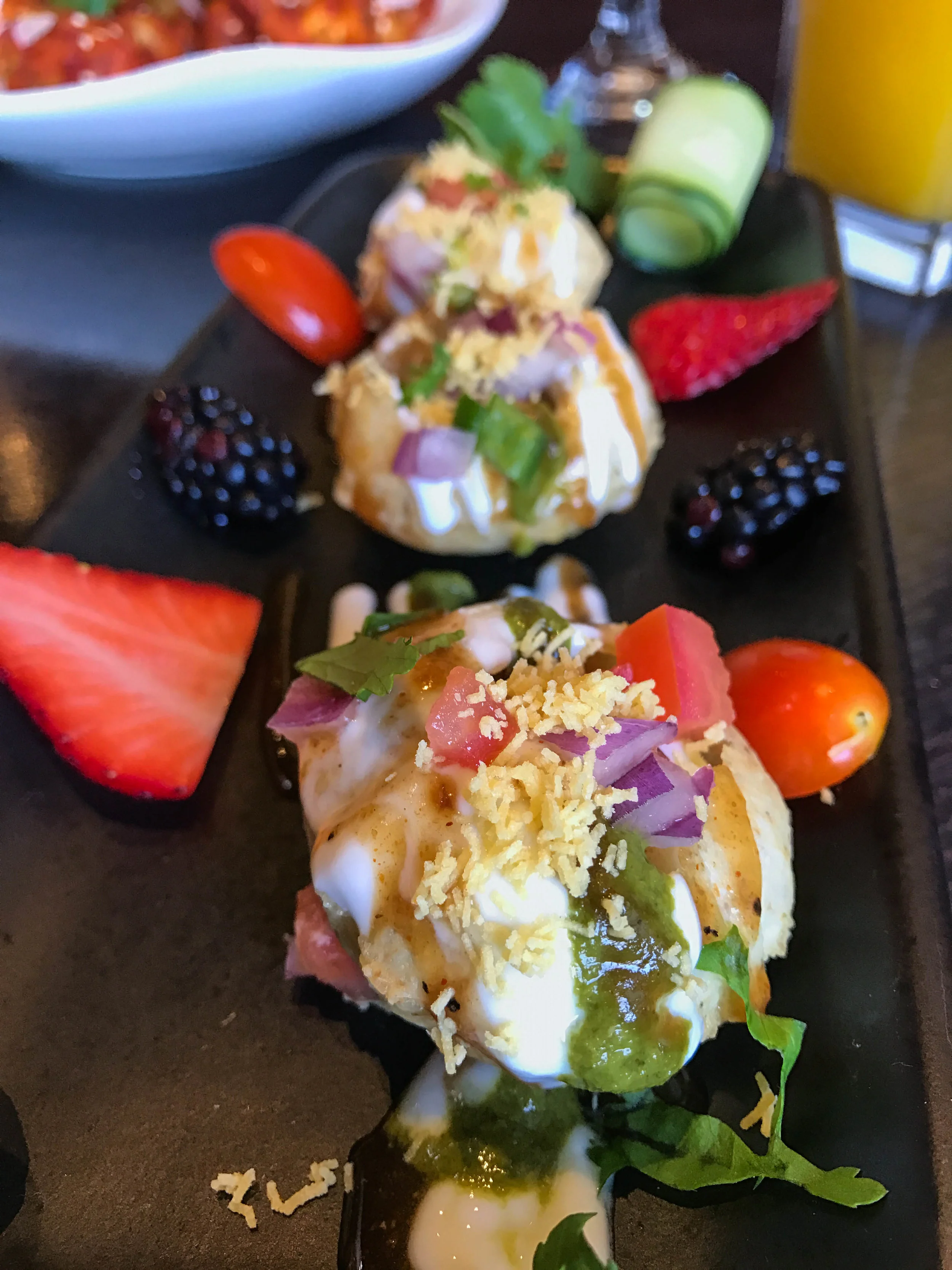 The Dahi Aloo Poori are airy little puffs stuffed with potatoes and chickpeas, and they're covered in chutneys and homemade yogurts. They're pretty flavorful and they don't feel really heavy so you can probably eat a serving of three by yourself. Eat these while they're fresh or they get all soggy from the fillings AND the toppings!