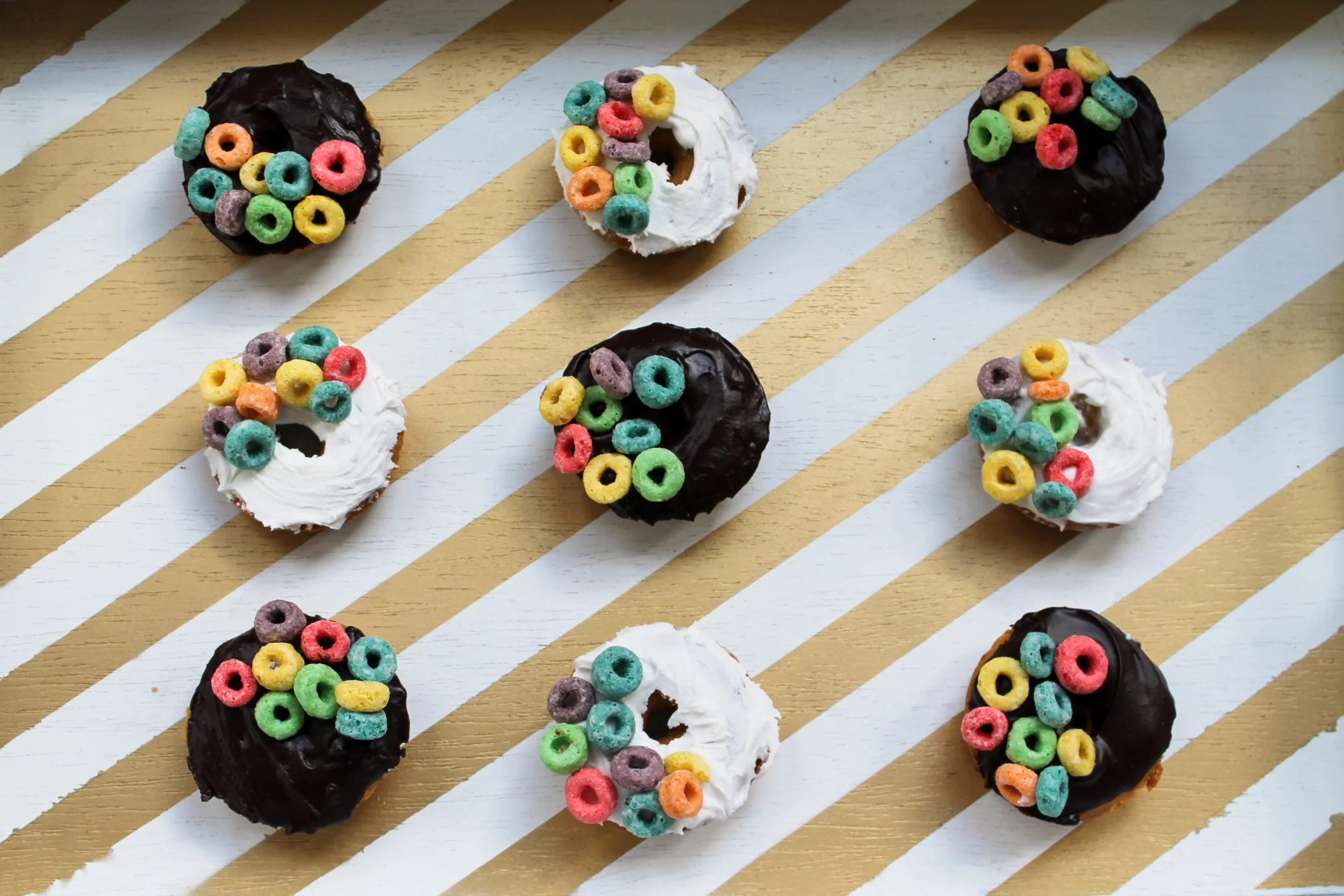 Once my donuts were done baking, I made a chocolate glaze and then used white icing from the store to cover the tops of the mini donuts. I used Fruit Loops for decorating, mainly because they're so colorful and I thought they would look pretty on Instagram 😂 I think Cinnamon Toast Crunch or any other sugary cereal would probably be a good topping!